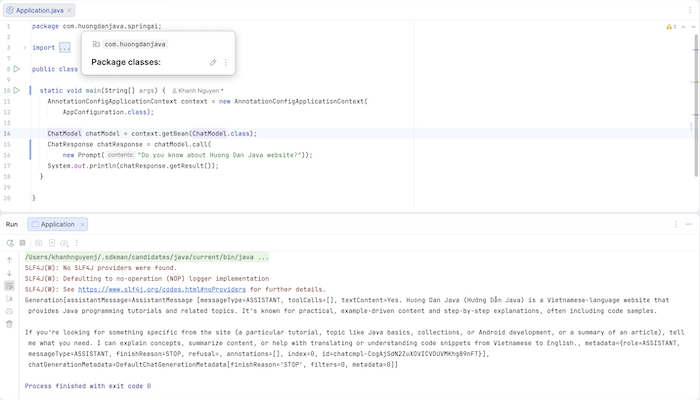package com.huongdanjava.springai; import org.springframework.ai.chat.model.ChatModel; import org.springframework.ai.chat.model.ChatResponse; import org.springframework.ai.chat.prompt.Prompt; import org.springframework.context.annotation.AnnotationConfigApplicationContext; public class Application { static void main(String[] args) { AnnotationConfigApplicationContext context = new AnnotationConfigApplicationContext( AppConfiguration.class); ChatModel chatModel = context.getBean(ChatModel.class); ChatResponse chatResponse = chatModel.call( new Prompt("Do you know about Huong Dan Java website?")); System.out.println(chatResponse.getResult()); } } |