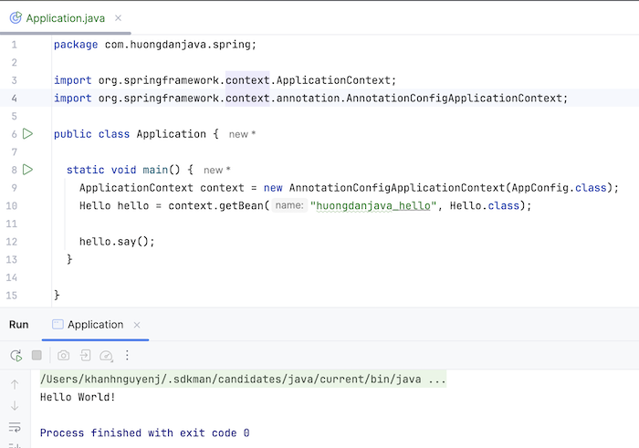 package com.huongdanjava.spring; import org.springframework.context.ApplicationContext; import org.springframework.context.annotation.AnnotationConfigApplicationContext; public class Application { static void main() { ApplicationContext context = new AnnotationConfigApplicationContext(AppConfig.class); Hello hello = context.getBean("huongdanjava_hello", Hello.class); hello.say(); } } |