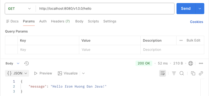 Lúc này, nếu chạy ứng dụng và request tới endpoint /v1.0.0/hello, kết quả các bạn sẽ thấy như sau: