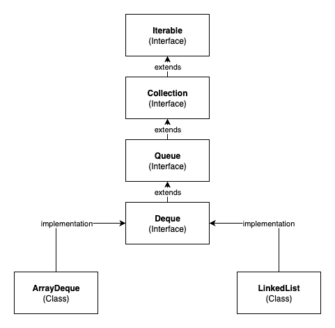 Interface Deque này extends từ interface Queue và nó có 2 implementation chính là ArrayQueue và LinkedList như sau: