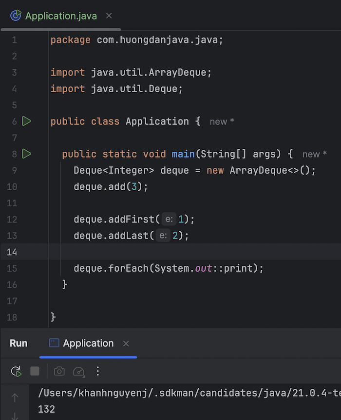 package com.huongdanjava.java; import java.util.ArrayDeque; import java.util.Deque; public class Application { public static void main(String[] args) { Deque<Integer> deque = new ArrayDeque<>(); deque.add(3); deque.addFirst(1); deque.addLast(2); deque.forEach(System.out::print); } } |