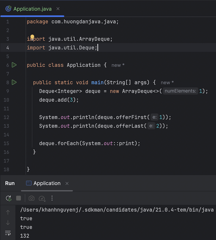 Trong ví dụ trên, ban đầu, deque của mình chỉ có phần tử là 3. Sử dụng phương thức addFirst() và addLast() mình có thể add thêm phần từ vào đầu và cuối. Kết quả như sau: