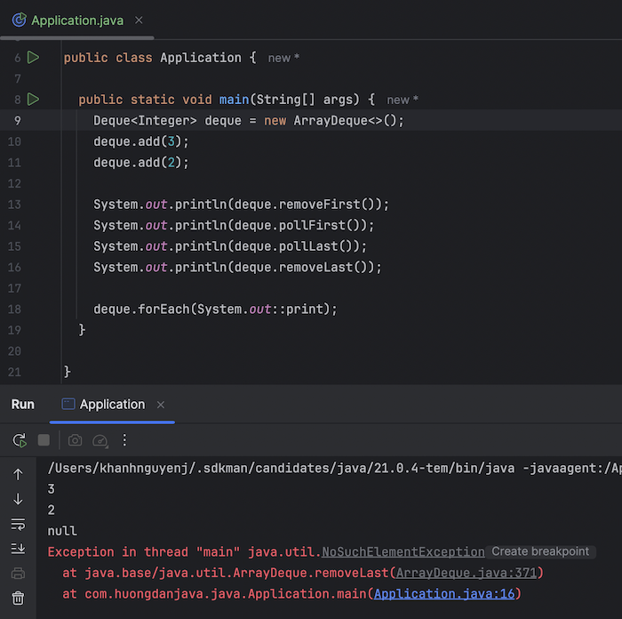 package com.huongdanjava.java; import java.util.ArrayDeque; import java.util.Deque; public class Application { public static void main(String[] args) { Deque<Integer> deque = new ArrayDeque<>(); deque.add(3); deque.add(2); System.out.println(deque.removeFirst()); System.out.println(deque.pollFirst()); System.out.println(deque.pollLast()); System.out.println(deque.removeLast()); deque.forEach(System.out::print); } } |