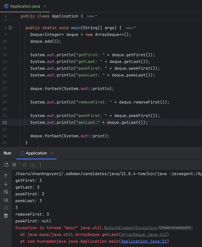 Các phương thức getFirst() và peekFirst() sẽ chỉ return cho chúng ta phần tử ở front mà không remove phần tử đó. Điểm khác biệt cũng là nếu không có phần tử nào để return, getFirst() sẽ throw java.util.NoSuchElementException, còn peekFirst() sẽ return lại giá trị null.